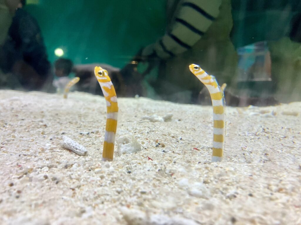 いまや水族館では定番のこちら。今までこれもチンアナゴだと思っていたら、名前は「ニシキアナゴ」でした。チンアナゴは色が白くて黒い斑点がある方だった。