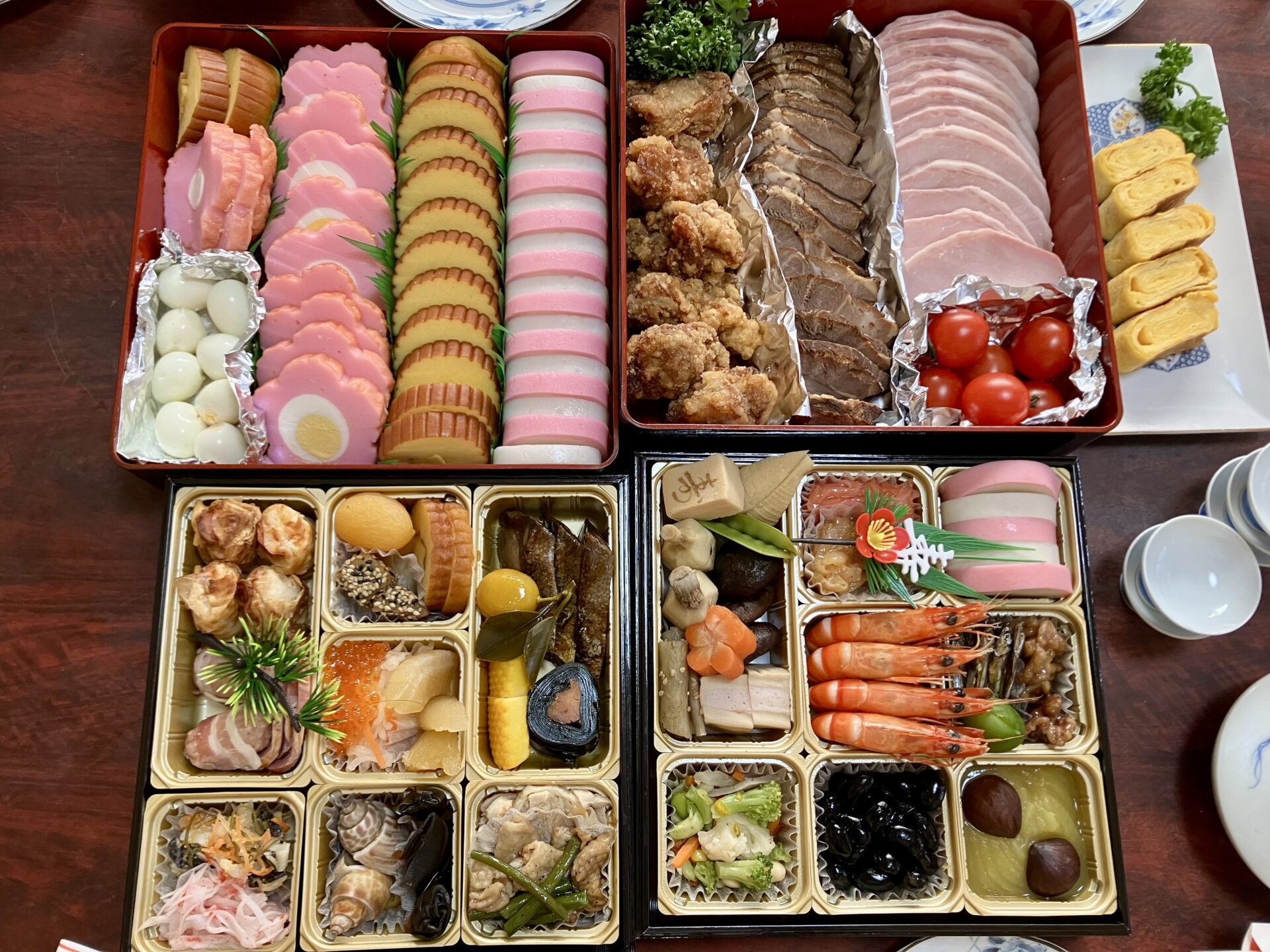 上の写真だと、下の2つがスシマスのおせちで、上の2つは実家で作ったおせち。